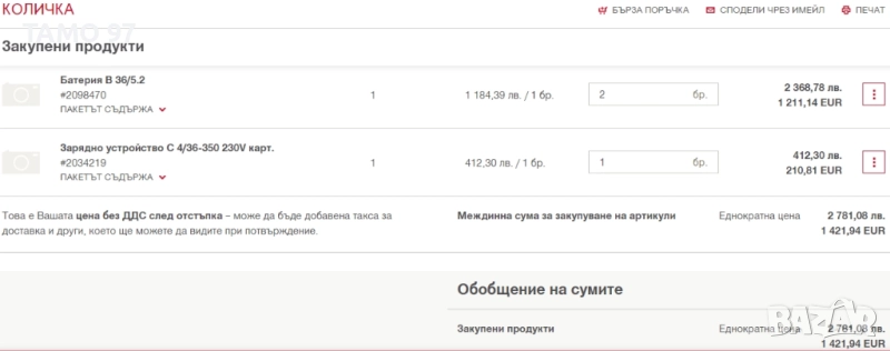 Пращаме с опция преглед и тест с куриерска фирма еконт може и лично предаване за гр. Шумен.Магазинската цена само на 2-те батерии и зарядно без машината е: 2 781лв БЕЗ ДДС (С ДДС е 3 337лв)