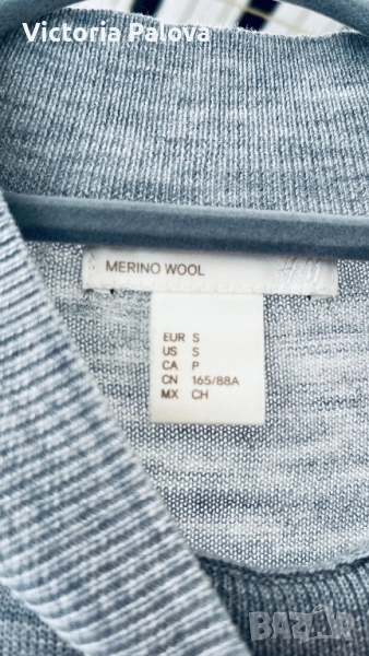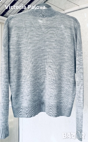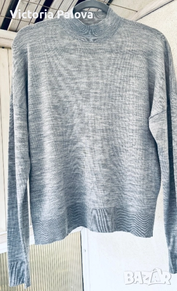 Изискан светлосив пуловер от фина , изключително мека мериносова вълна. Материята е много тънка и гладка като коприна - стои елегантно и леко, без да утежнява силуета. Късата прибрана яка придава модерен минималистичен вид. Подходящ както за офис или среща, така и за ежедневен стил с дънки. Рамо ( паднало) - 71см, ГО - 60см, дължина - 62см, ръкав - 54см.