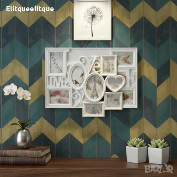 Снимките ти са разпръснати, а у дома липсва романтичен акцент? Многорамковата фоторамка Love (61×40,5 см) събира до седем снимки в различни форми – овал, сърце, правоъгълник – и ги обединява под надписа „Love“. Елегантният декоративен елемент с листа и роза подчертава темата, а изборът между бяло и антично бронзово позволява да се впише в различни интериори. Изработена от здрава пластмаса със стъклени панели, рамката се монтира лесно на стена, снимките се сменят без усилие и остават защитени от прах. Няма нужда от множество отделни рамки – получаваш цялостна композиция с един монтаж. Тя съчетава практичност и емоция, превръщайки се в акцент във всяка стая. Така подреждаш спомените си, освежаваш дома и имаш прекрасен подарък за близки.