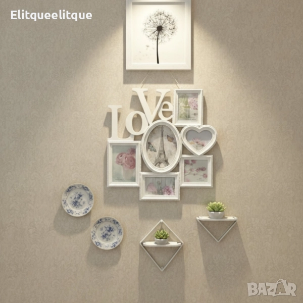 Ако снимките ти са разпилени и няма романтично докосване в интериора, тази декоративна рамка Love (38 × 42 см) събира до седем снимки в различни форми – овал, сърце и правоъгълник – и добавя настроение. Композицията от различни форми и големият надпис „Love“ подчертават темата и позволяват творческа подредба. Рамката се предлага в класическо бяло за свеж интериор и антично бронзово за ретро стил. Изработена от здрава пластмаса, монтира се лесно на стена, а стъклените панели предпазват снимките от прах. Лесната смяна на снимките ти позволява да обновяваш композицията според сезона или настроението. Така спомените оживяват пред очите ти всеки ден, без да затрупваш дома си с много отделни рамки, и рамката става прекрасен подарък или акцент в дома.