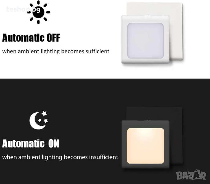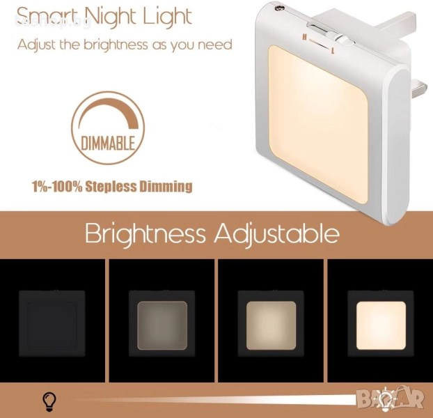 [Автоматично ВКЛ./ИЗКЛ. ]: Тази вградена интелигентна нощна лампа с регулируема яркост и сензор от здрач до зори се активира само в тъмното и се изключва, когато стаята ви стане светла от слънчева светлина или осветление отгоре.