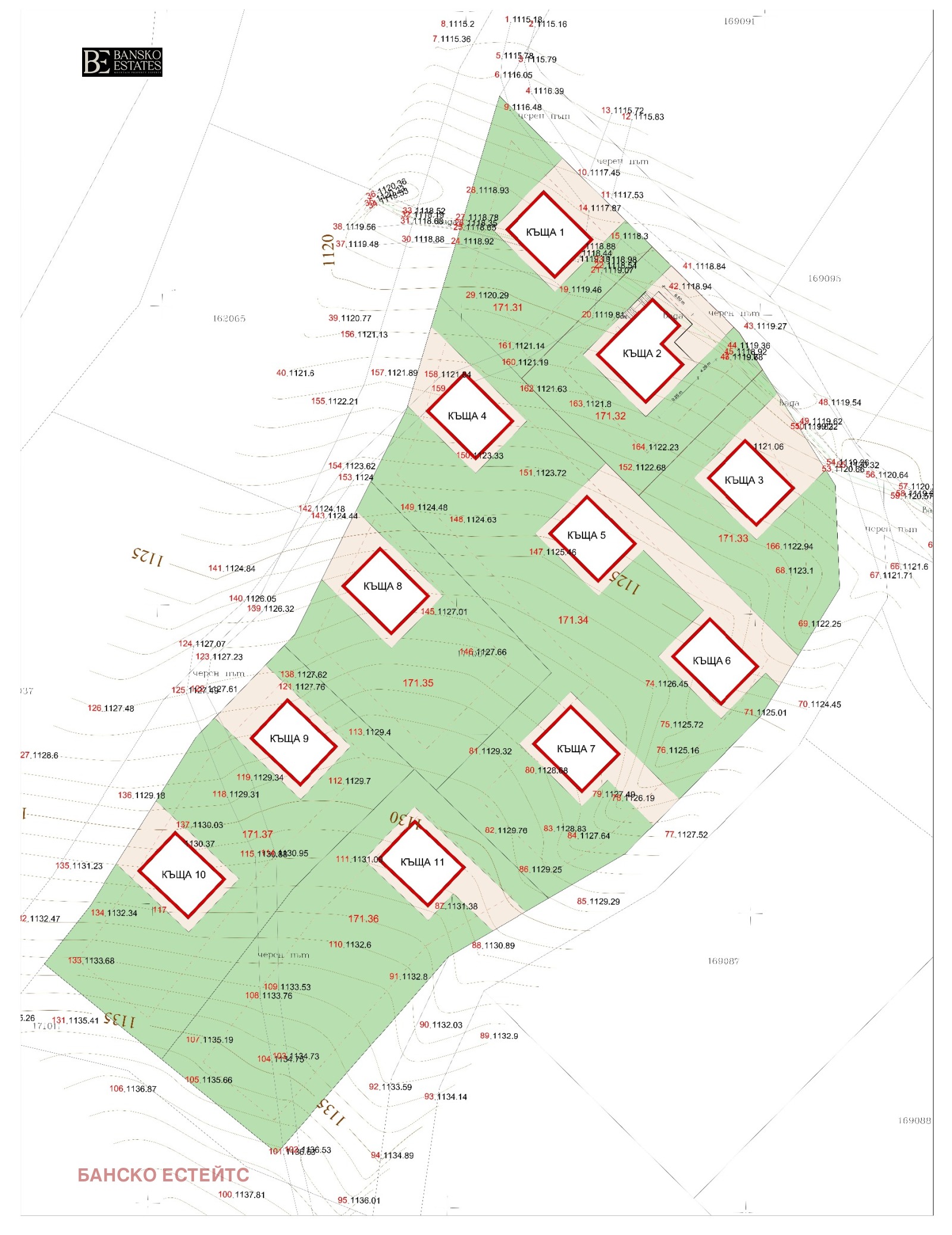 Теренът заема площ от 10 418 кв.м, което осигурява достатъчно пространство и уединение за всяка къща. Проектът включва 11 отделни къщи, всяка от които е проектирана с оглед на максимален комфорт и естетика.