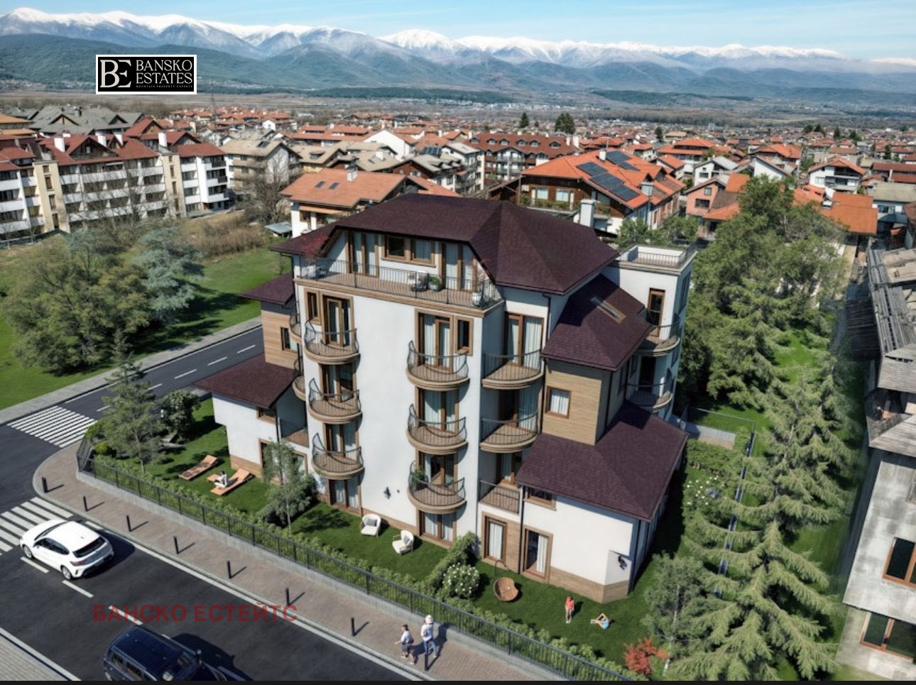 Разположена в подножието на Пирин планина, сградата съчетава спокойна природна среда с удобен достъп до начална станция на ски лифта и стария център на Банско.