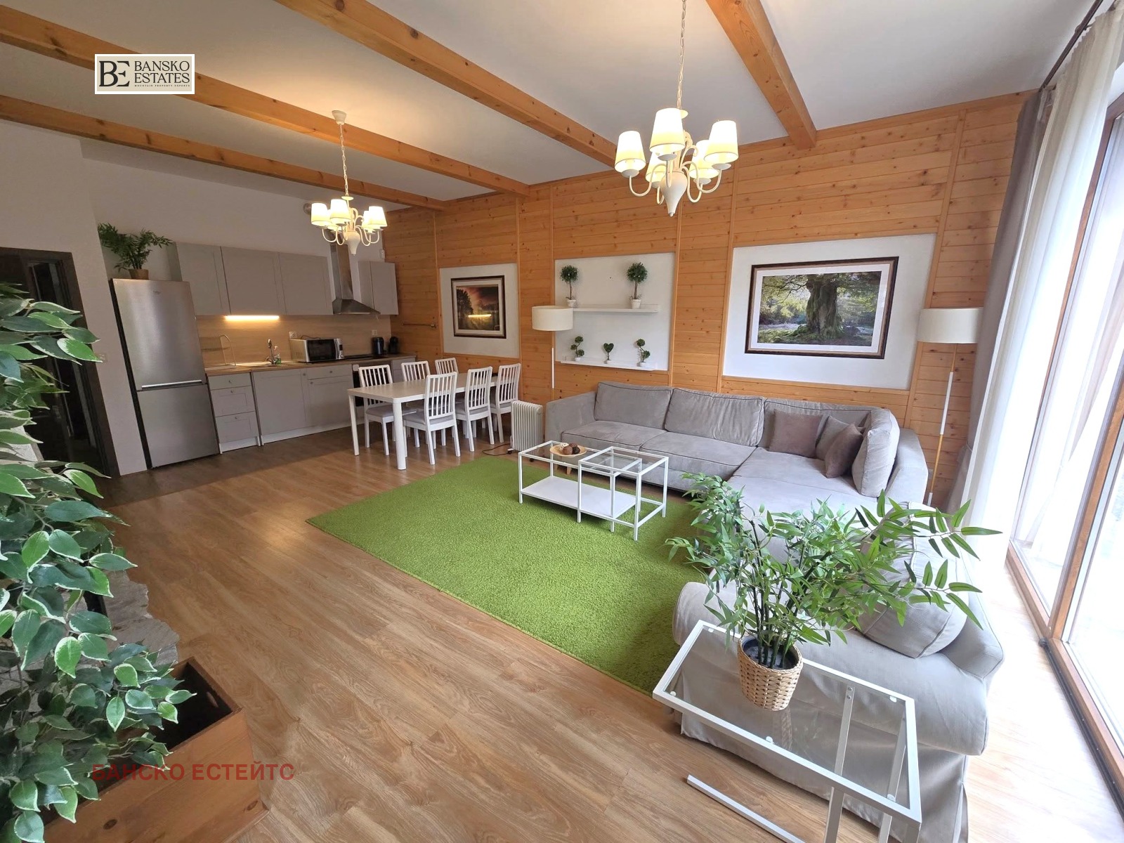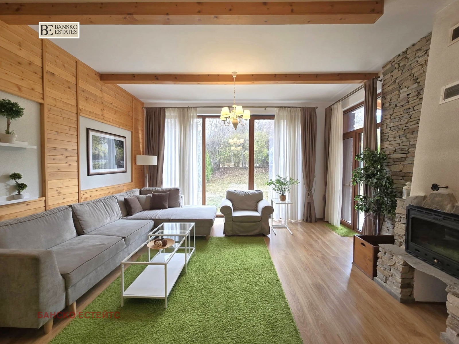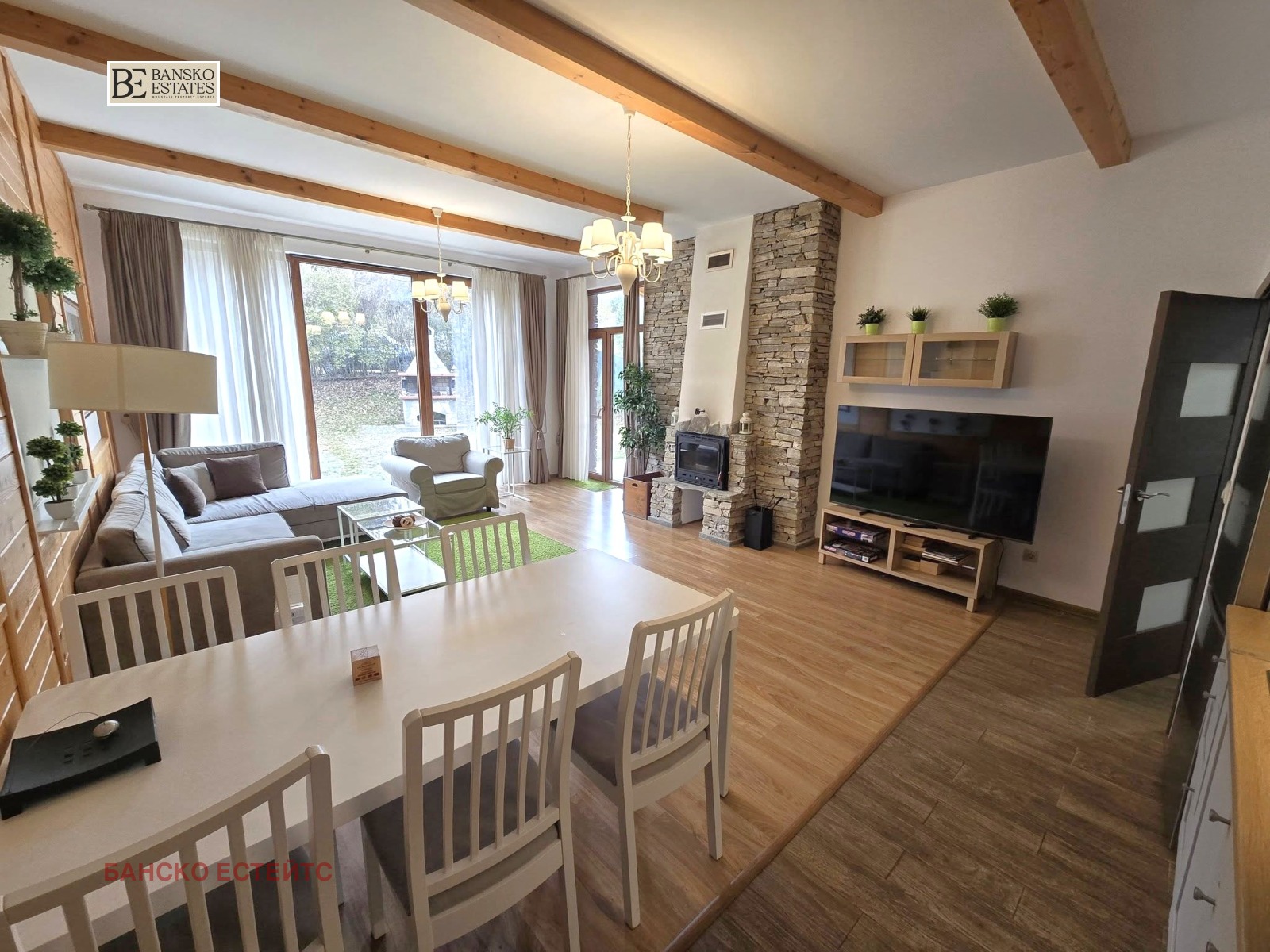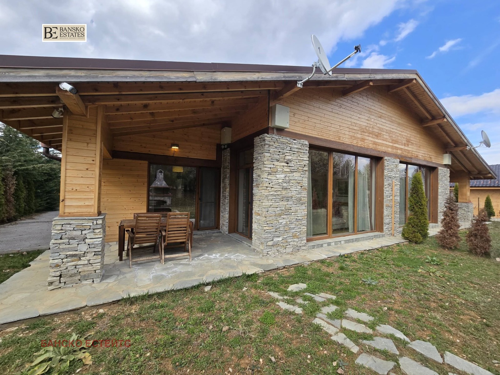 Bansko Estates с радост Ви представя ексклузивно предложение за продажба луксозна едноетажна къща в алпийски стил, разположена в изключително удобна близост до Пирин Голф с три спални и обширен двор, този недвижим имот предлага уникално съчетание от комфорт, елегантност и високо качество на живот.