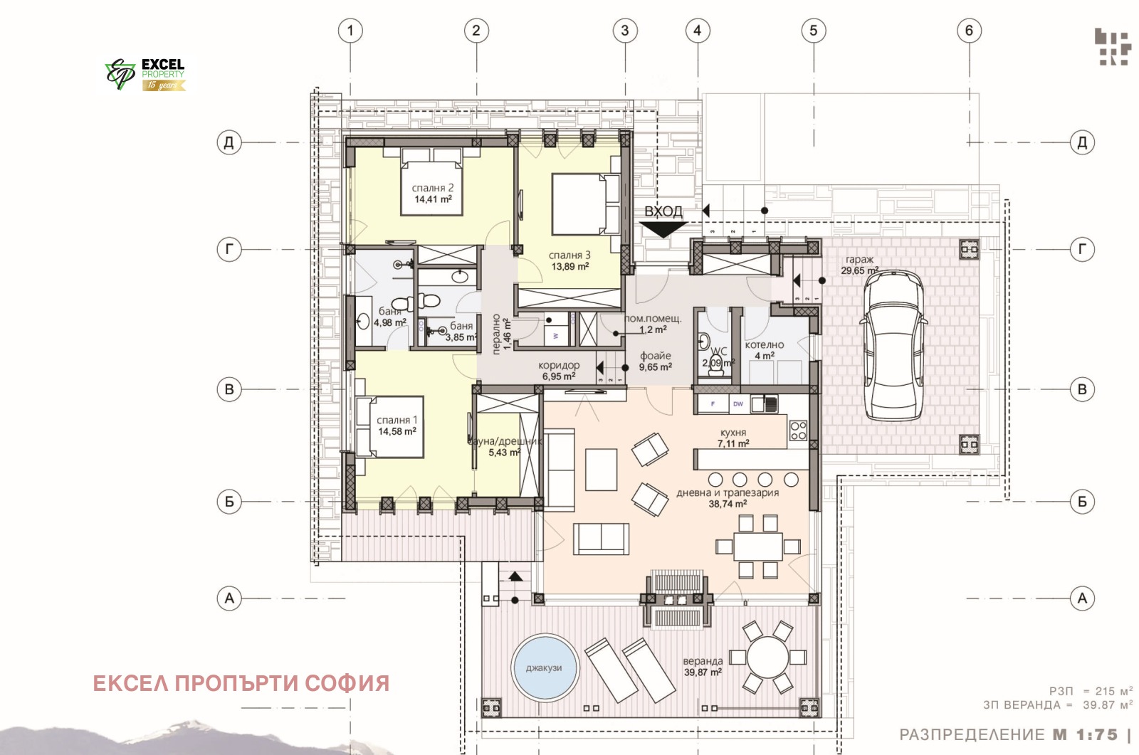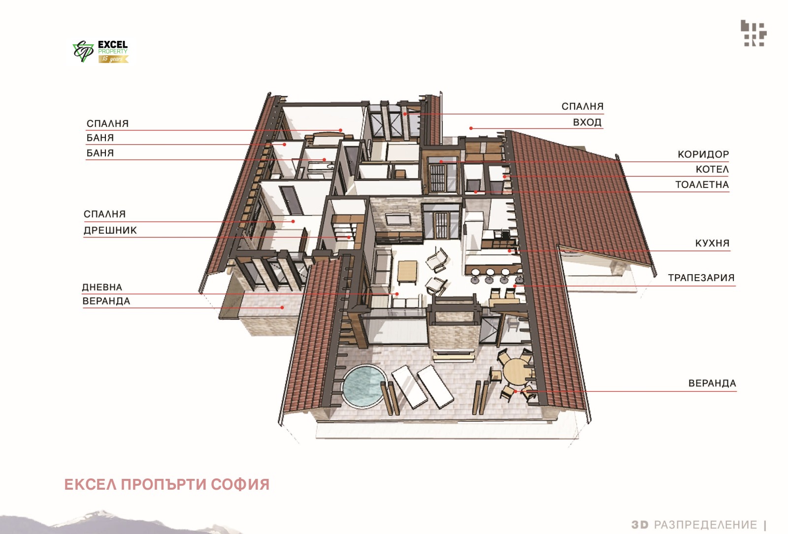Къщите са проектирани с функционално вътрешно разпределение, включващо просторна дневна зона с възможност за камина, три спални (едната със самостоятелна баня и дрешник), три санитарни възела, складово помещение, котелно и гараж, свързан с основната сграда. Проектът предвижда и покрита веранда с площ от 39.87 кв.м, подходяща за зони за отдих или джакузи. Разположението на всяка къща е съобразено с теренните дадености, с цел осигуряване на оптимална гледка към планината и уединение.