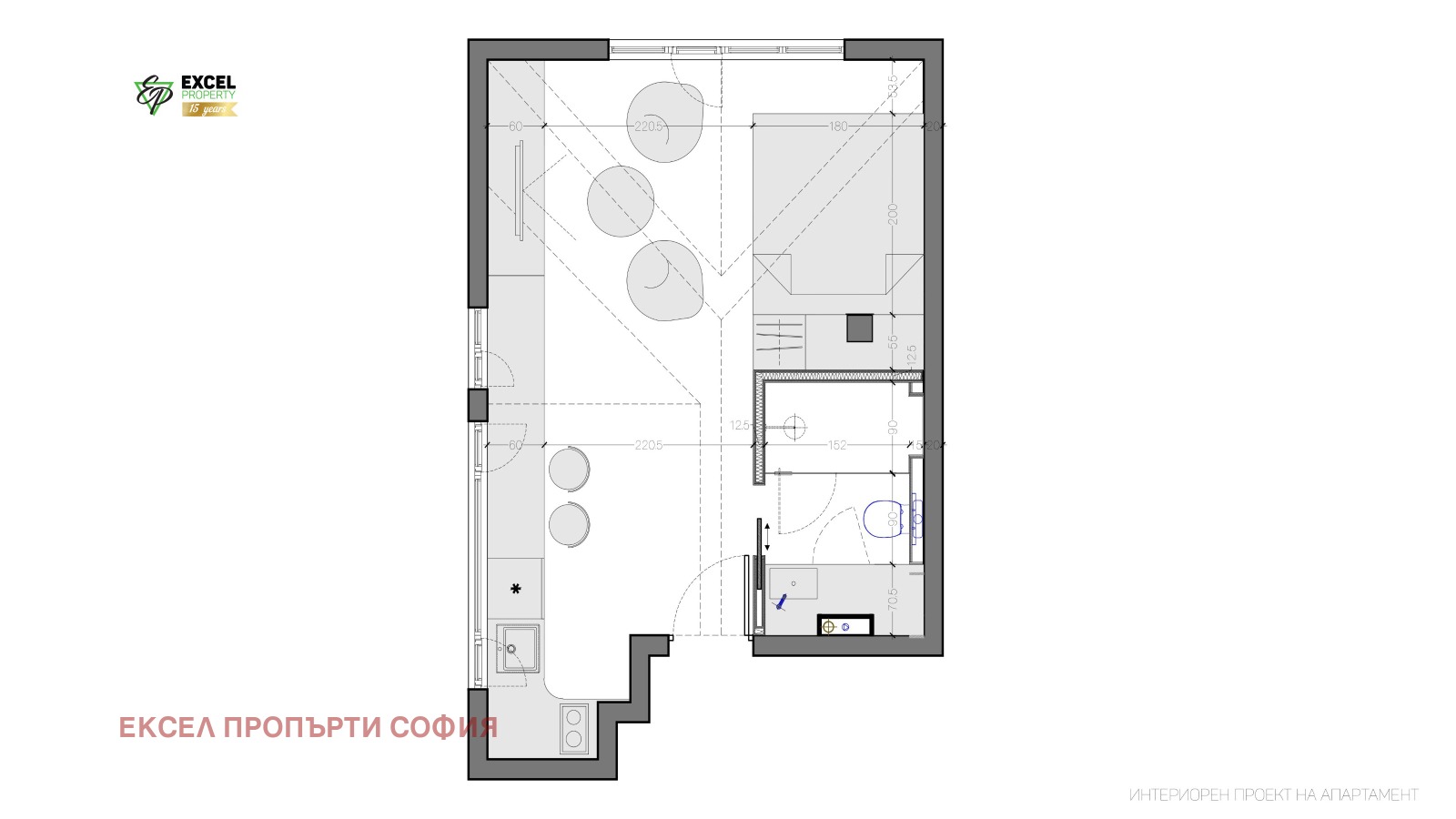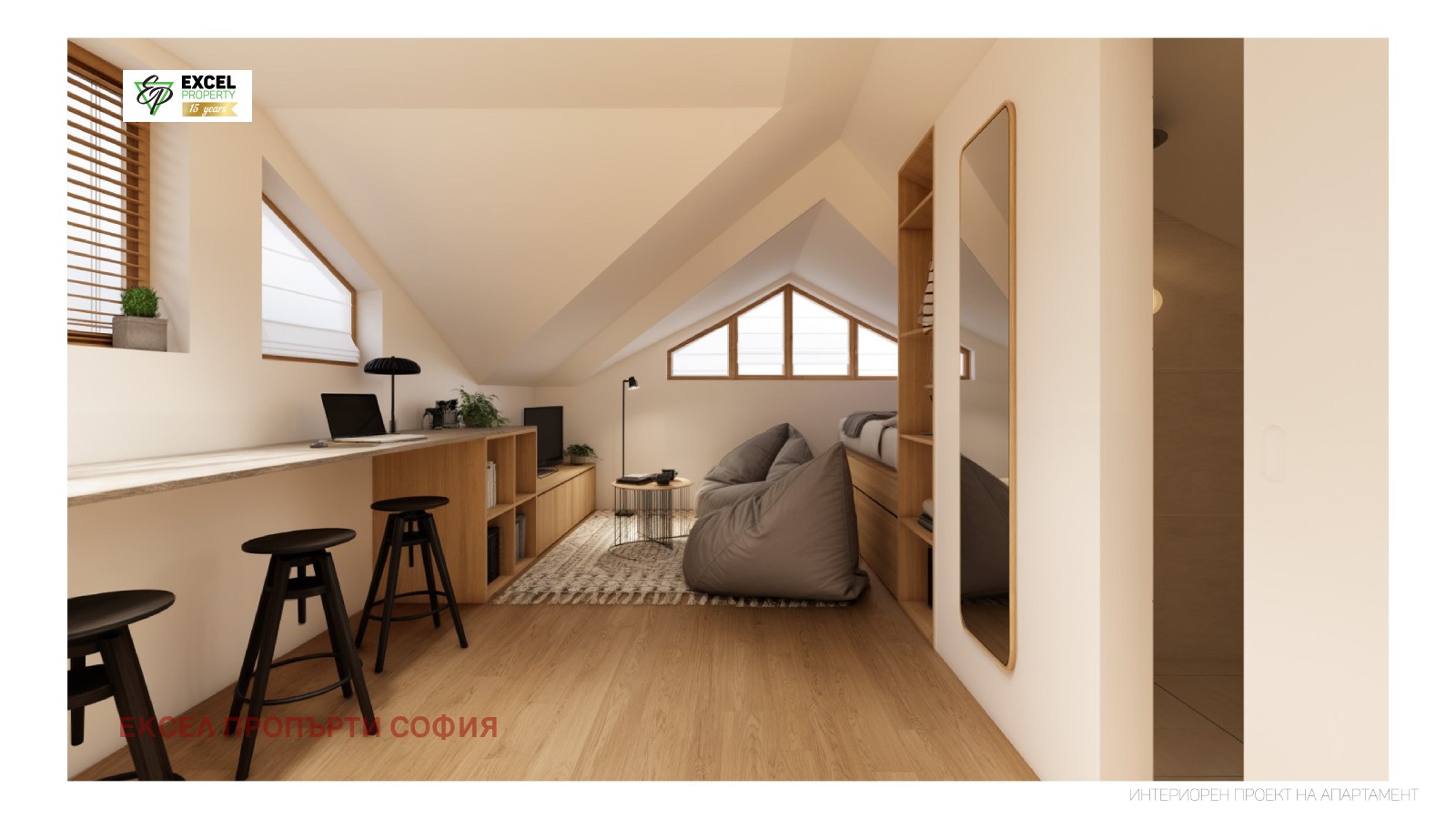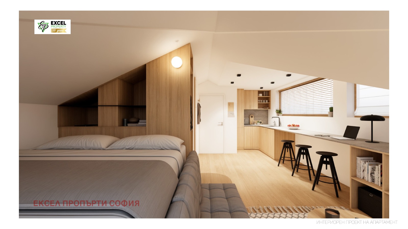 Имотът се предлага с професионално изготвен проект, съобразен с всяка възможност за максимална функционалност и уют, включително идеи за разделяне на зони, скрито съхранение и оптимално разположение на мебелите. Проектът е отлична основа както за лично ползване, така и за отдаване под наем.