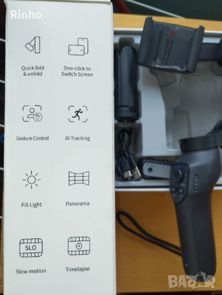 Гимбалът се зарежда с USB-C кабел приложен в комплекта. В кутията има още сгъваем трипод за стабилно поставяне върху плот, маса или друга равна повърхност, както и каишка за придържане към китката на ръката.