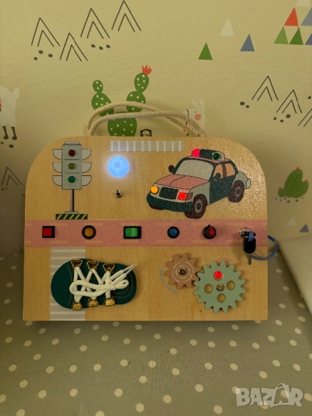 Монтесори игра Busy Board Traffic, двойна, с 8 дейности, изработена от дърво