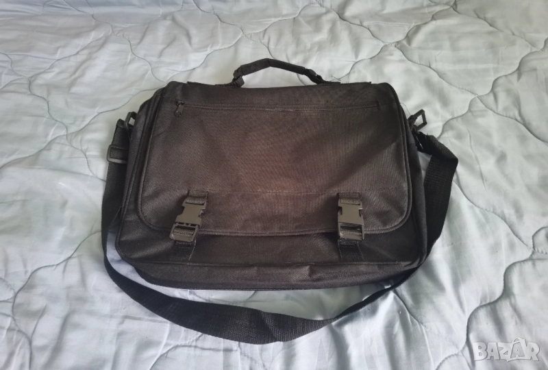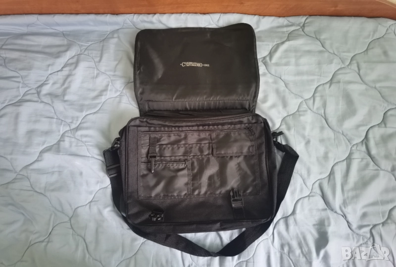 48. Черна чанта с презрамка за лаптоп с 15 джоба. 4 джоба с цип (един отпред на капака, един, където стои лаптопа и 1 по-малък и 1 най-малък), 4 тесни и високи за писалки, 1 джоб с лепенка и 6 други с различна големина. Има и отделен цип, с който може да се разшири дебелината на чантата, тоест да събира повече неща. Размери: 40 см дължина и 30,5 см ширина. Отдавна е купувана, но не е използвана