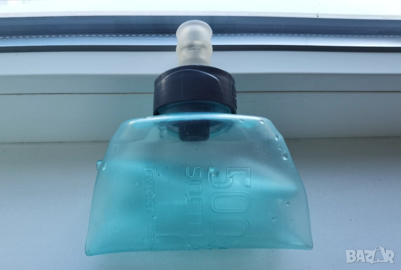 32.Сгъваема бутилка Softflask- 500 мл. Използвана е 10 дни, но е в отлично състояние. На капачката има клапа и не може да се пие от накрайника, който се поставя в устата, ако не се завърти. Като се сгъне заема много малко място. Подходяща за бягане или за туризъм. Дизайнът е френски. Произведена също във Франция