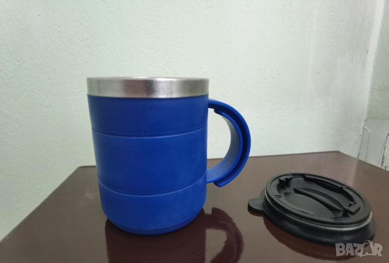 42. Синя термочаша с капак. От външната страна покритието е пластмаса, а в горната част и отвътре чашата е метална.