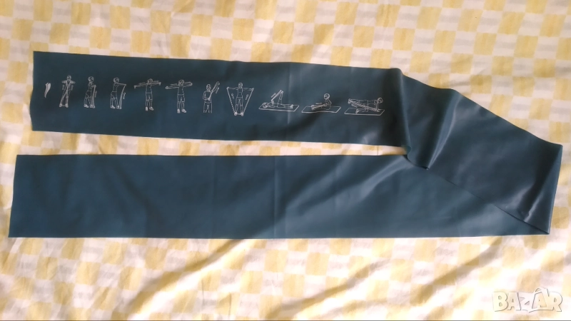 Размери: 200 см х 15см х 0,3мм Произведена е от латекс. Има примерни упражнения, изобразени на самата лента. Също така изпращам и отделен лист с примери за упражнения, които могат да се правят с тази лента.
