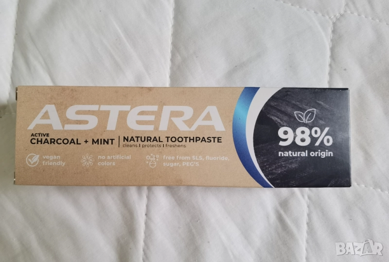36.Паста за зъби Astera Natural Charcoal and Mint с 98% съставки с натурален произход. Черна паста за естествено бели зъби благодарение на съдържащия се в нея активен въглен. Органичното масло от лютива мента гарантира дълготрайно свеж дъх, а внимателно подбраните активни съставки и ксилитолът редуцират образуването на кариеси и зъбна плака.