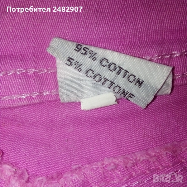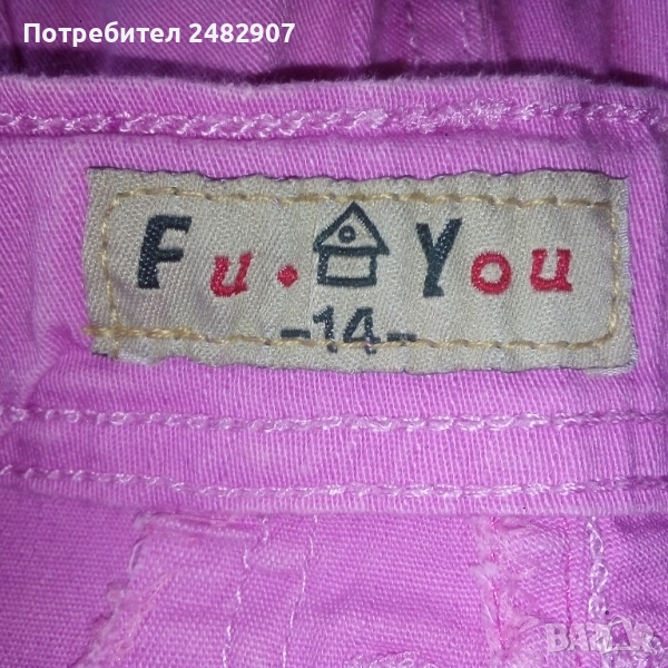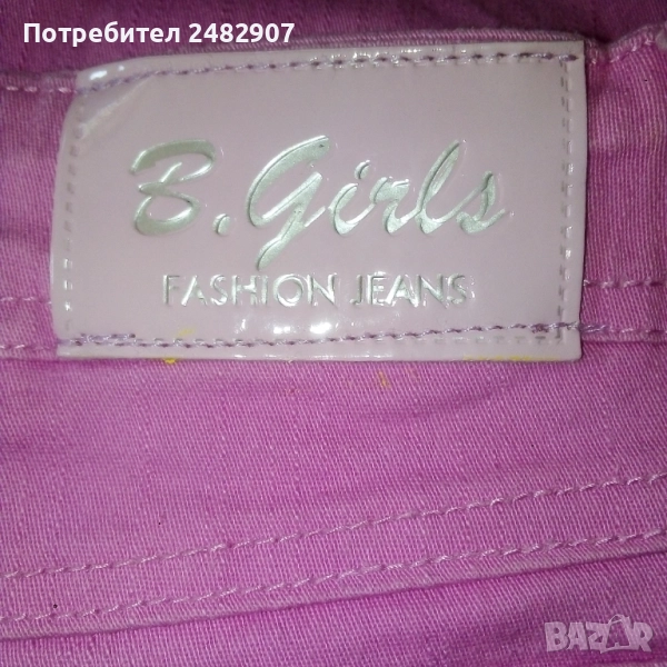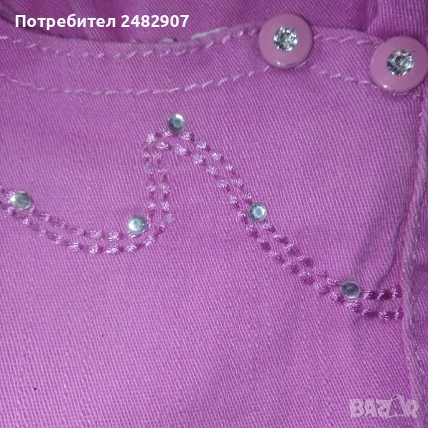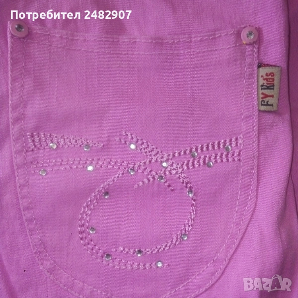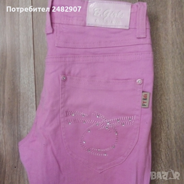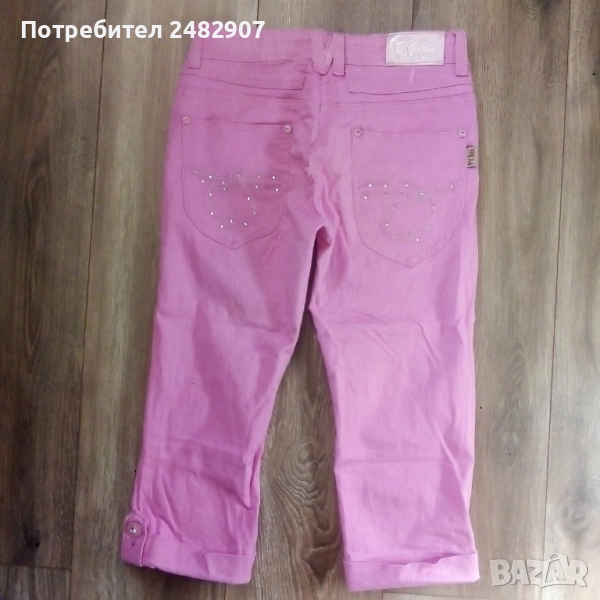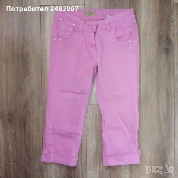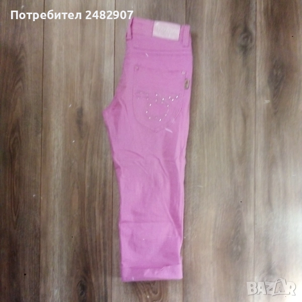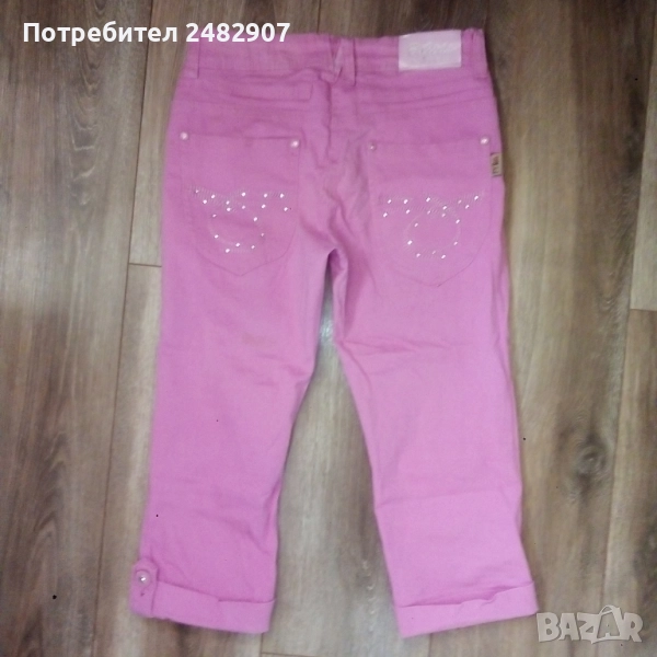 Детски розов дънков 7/8 панталон за възраст 14 години. Съдържа 95 % памук и 5 % еластан. Ширина в талията - 35 см, дължина от талията до чатала - 20 см, дължина от талията до долу - 67 см, ширина на крачола в долната част - 16 см. Много запазен, почти не е използван, с регулируем ластик в талията и блестящи малки камъчета.