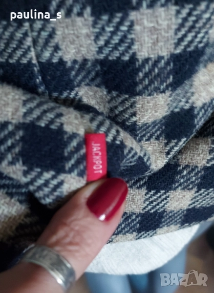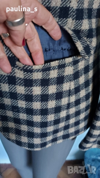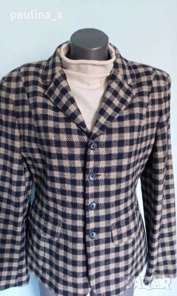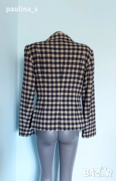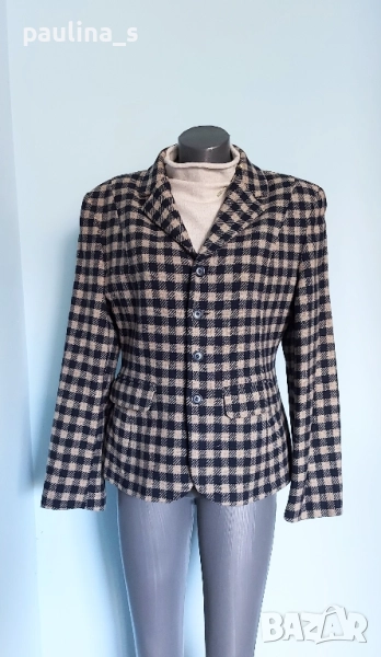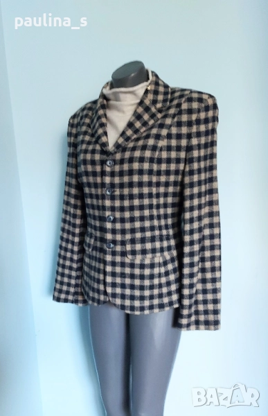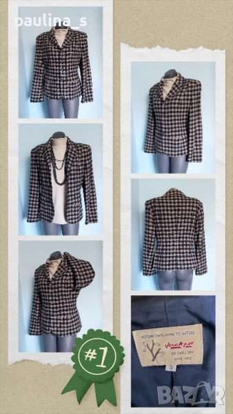 1️⃣. Колаж / L / XL - "Jackpot" by Carly Gry. Цената е крайна, без пазарлъци 49,99лв / 25 евро. Винтидж!!! Дамско марково сако от вълна. Десенът е тъмно синьо и сахара в каре. На снимките се вижда добре логото на бранда. Много изискана и стилна дреха. Силуетът е втален и е елегантен, с широки рамене, без дефекти на хастара, платът е 100% вълна.