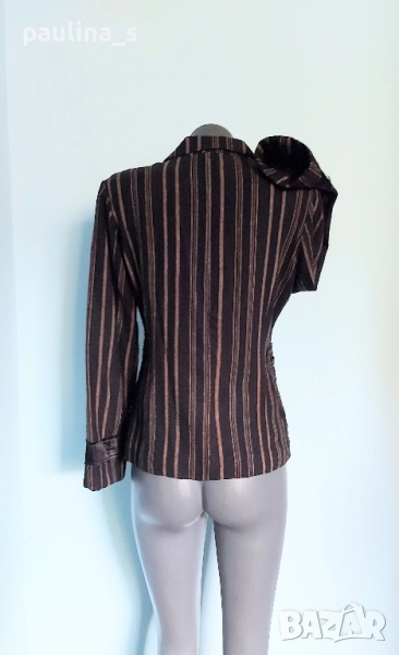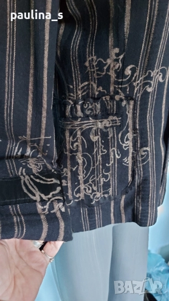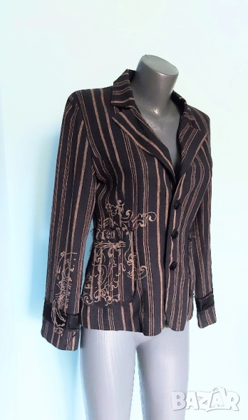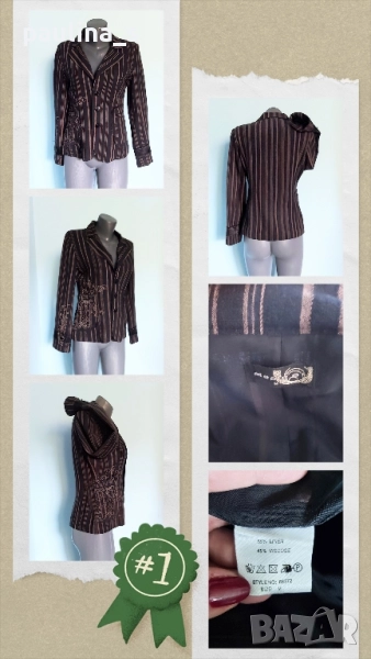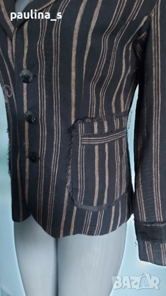 2️⃣. Колаж / M / L - "Repeat". Цената е крайна 29,99лв / 15 евро. Разчупен, декориран модел брандово сако от лен с примеси. Декорациите са от щамповани апликации на десния джоб. Десен в черно райе. Джобовете са цели, с прорезни филетки. Силуетът е изчистен, обран, като се акцентира върху елегантността и перфектната изработка. Хастарът е полиестер.