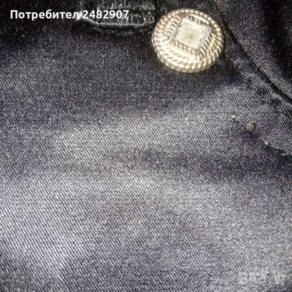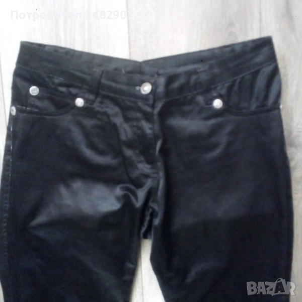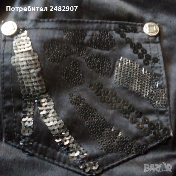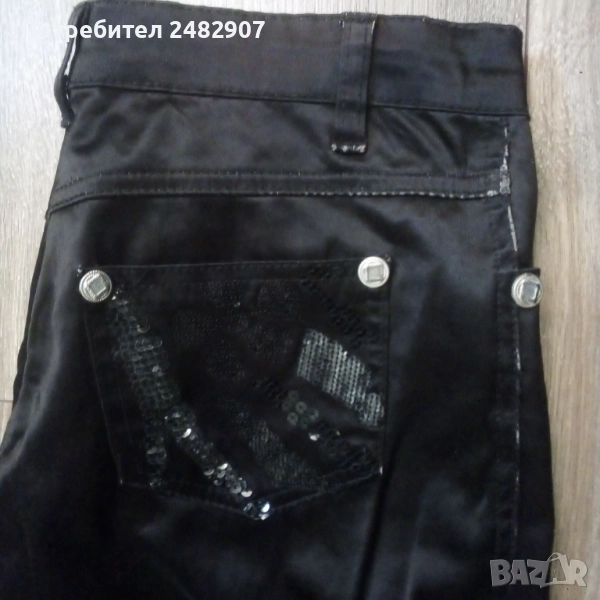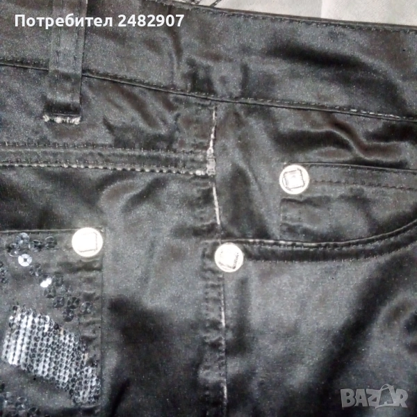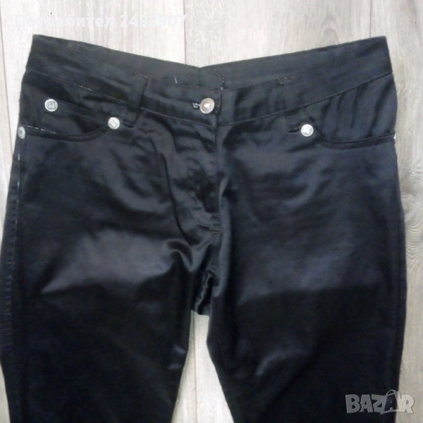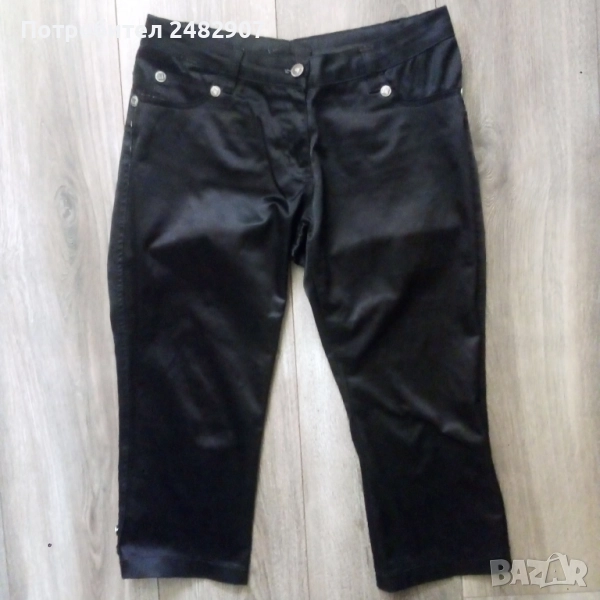Сатенен черен дамски 7/8 панталон, размвр S. Ширина в талията - 38 см, дължина от талията до чатала - 20 см, дължина от талията до долу - 69 см, ширина на крачола в долната част - 18 см. Запазен, с нормални следи от използване, леко еластичен, с пайети на задните джобове и дребни забележки, видими от снимките.