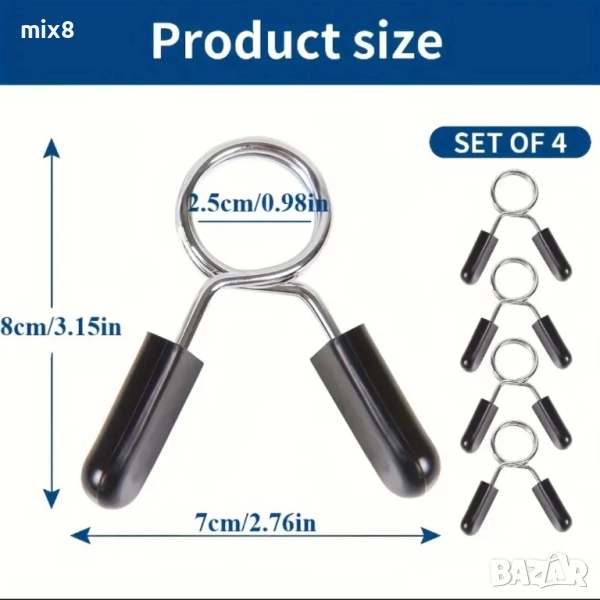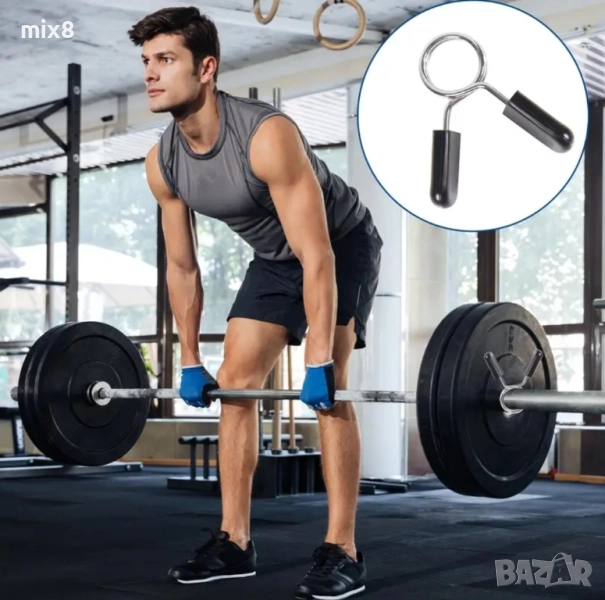 Пружинни скоби за щанга, предназначени да държат тежестите сигурно на място по време на тренировка.