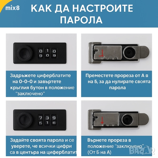Сейфът е с комбинационен код за заключване, което осигурява надеждна сигурност.