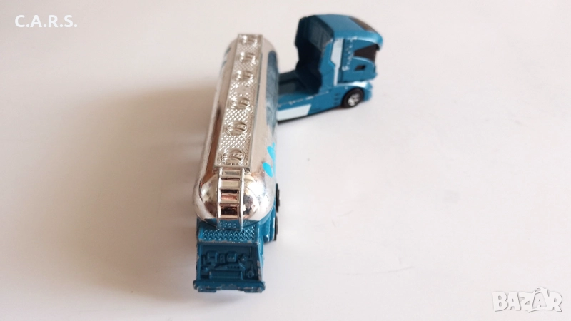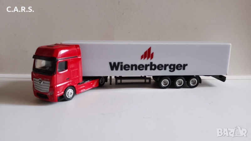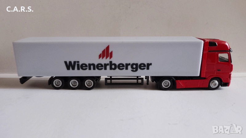 Метален камион с ремарке, Mercedez Benz Actros. Влекача е метален, а ремаркето от пластмаса. Размери 19 / 4.7 / 3 cm. - 8 EURO.