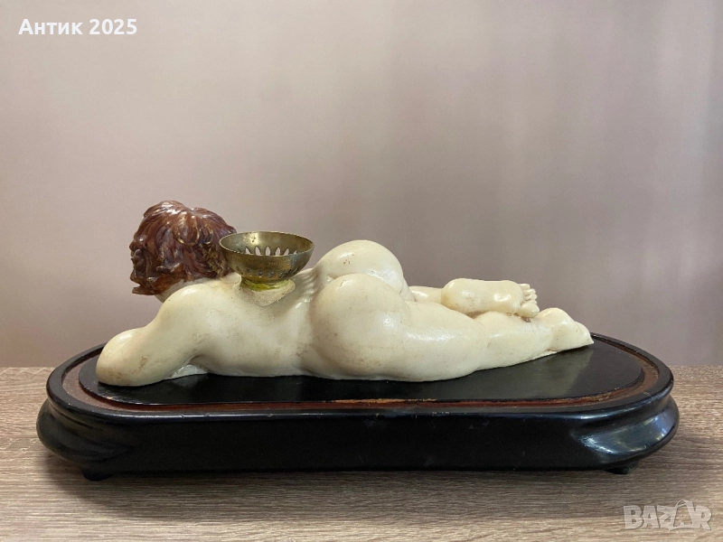 Рядък винтидж свещник от средата на XX век, изработен в Испания, град Валенсия. Фигурката изобразява легнал амур (купидон) с бронзова чашка за свещ върху гърба. Материалът е композит с имитация на слонова кост, косата е боядисана на ръка. Монтиран е върху масивна лакирана дървена основа с овална форма.