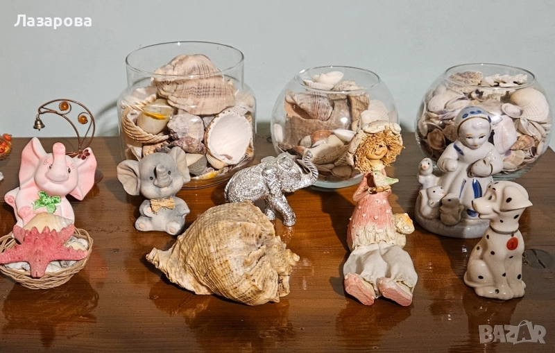 Колекция от декоративни предмети за дома - сувенири, миди, рапани, корали, вази и ледарка. Предметите са в прекрасно състояние и са готови да украсят вашия дом. Възможни са договорки за цените.