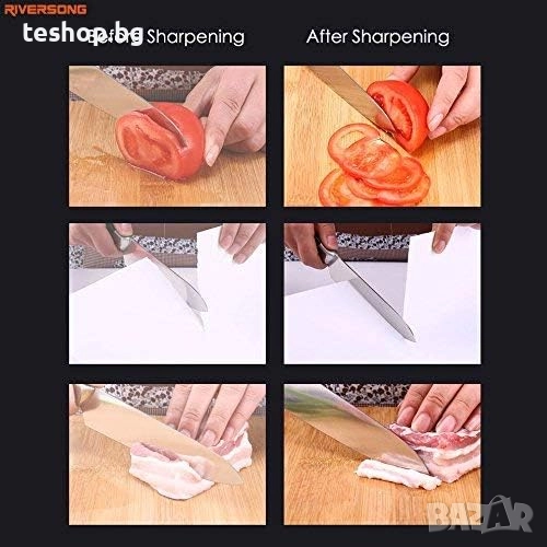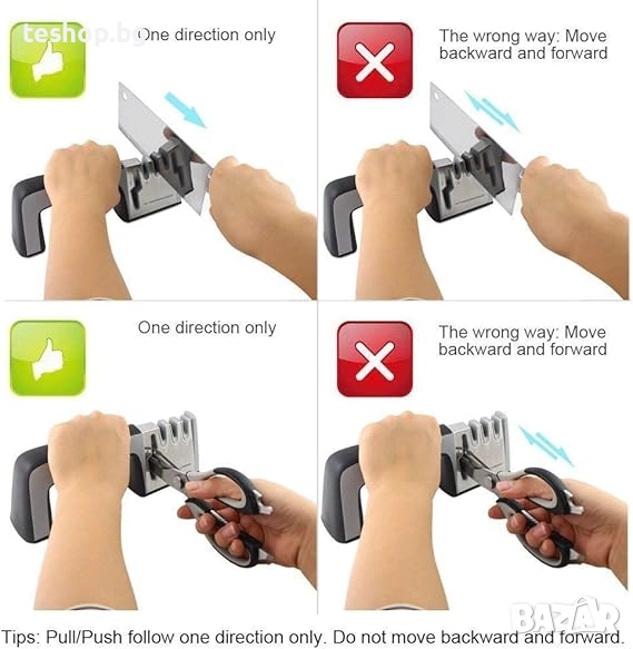 Работи за всички видове остриета. Слот 1 за точене на ножици, Слот 2 за грубо шлифоване за тъпи метални ножове, Слот 3 за средно шлифоване за ежедневна употреба или керамични ножове, Слот 4 за фино шлифоване за довършителни работи и полиране на ръбове.