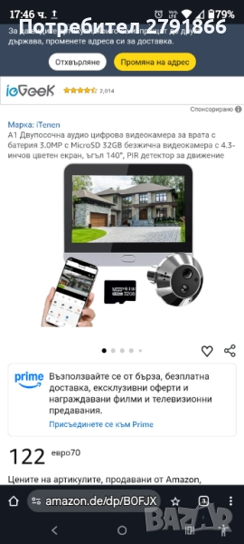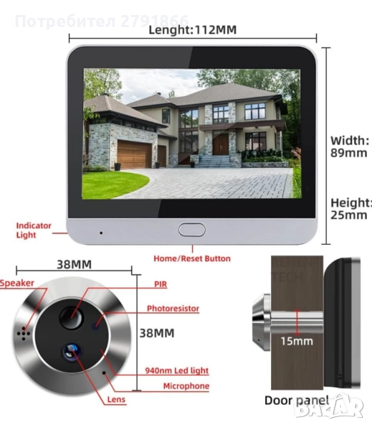 WIFI Видеошпионка за врата с батерия 3MP MicroSD32GB с видеокамера, 4.3" екран двупосочно аудио