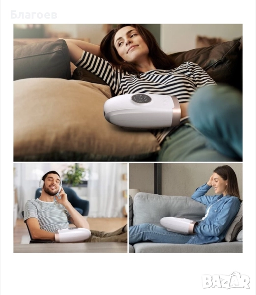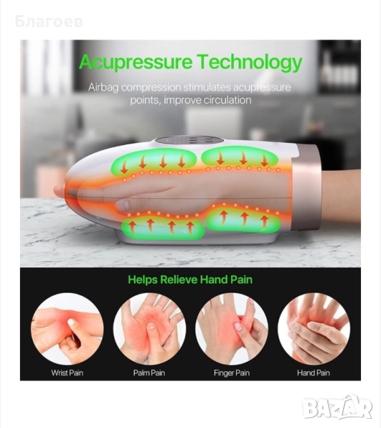 акупунктура заедно с компресия с въздушна възглавница, която действа върху ключови точки на ръката ви. Той има и функция за нагряване, за да помогне при мускулна болка или изтръпване. С 6 вида масаж, 6 интензивности и 2 вида вибрации това устройство ще ви осигури релаксиращ масаж и ще облекчи болките ви.
