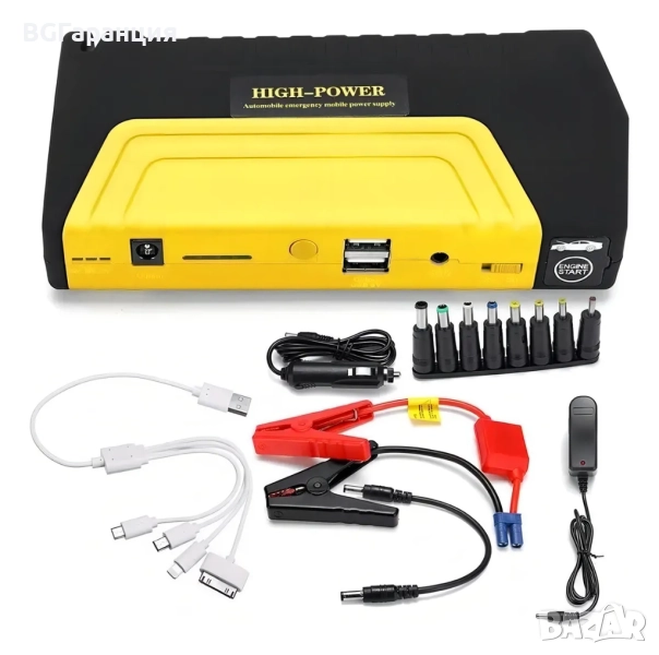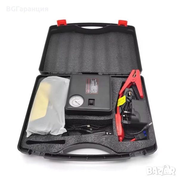 Този комплект стартерно устройство с висока мощност е идеален за автомобили и други превозни средства. С капацитет от 68800mAh, устройството осигурява мощен старт на вашия автомобил, дори когато батерията е напълно изтощена. В допълнение към функциите за стартиране, комплектът включва и компресор за бързо надуване на гуми. Стартерното устройство предлага и вградена LED лампа с три режима на осветление (червено, синьо и бяло), което го прави полезно в аварийни ситуации или за осветяване на тъмни пространства. В комплекта са включени и кабели за свързване, зарядно за устройство и кабели за различни нужди. Това мултифункционално устройство е перфектно за всеки, който иска да бъде подготвен за непредвидени ситуации на пътя.