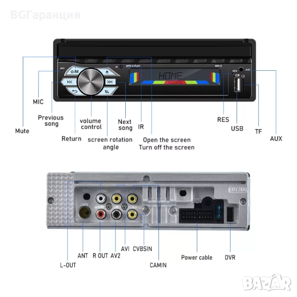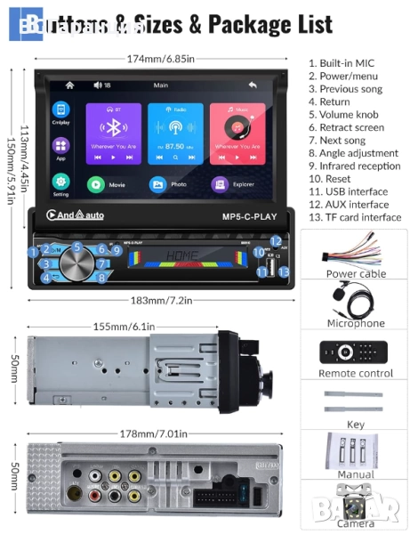 Функции: Bluetooth, FM радио, възпроизвеждане на видео/музика/снимки, камера за задно виждане, вграден микрофон