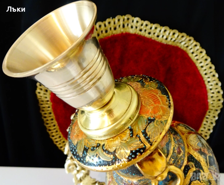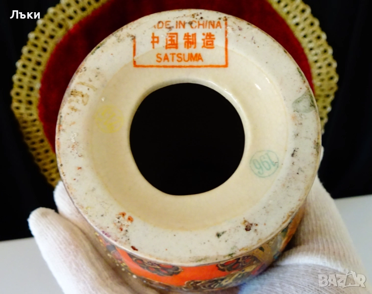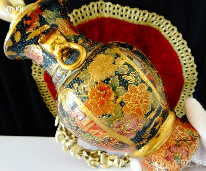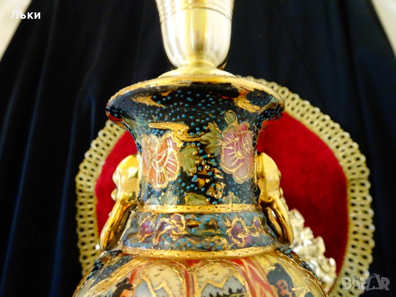 бронз.Тялото на свещника е китайски порцелан,ръчно рисуван Satsuma с релефно злато 24 карата и изпъкнали цветни емйли Moriage.Представена е сцена с