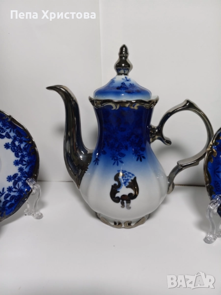Сервиз за чай от румънски порцелан с наситена подглазурна кобалтова декорация и нежен платинен кант - Alba Julia, изработка около 1960-1980г.