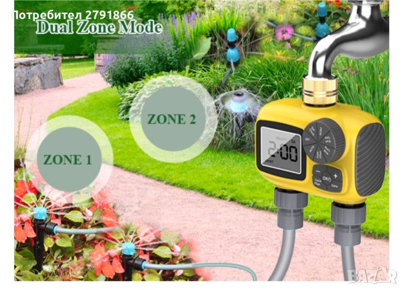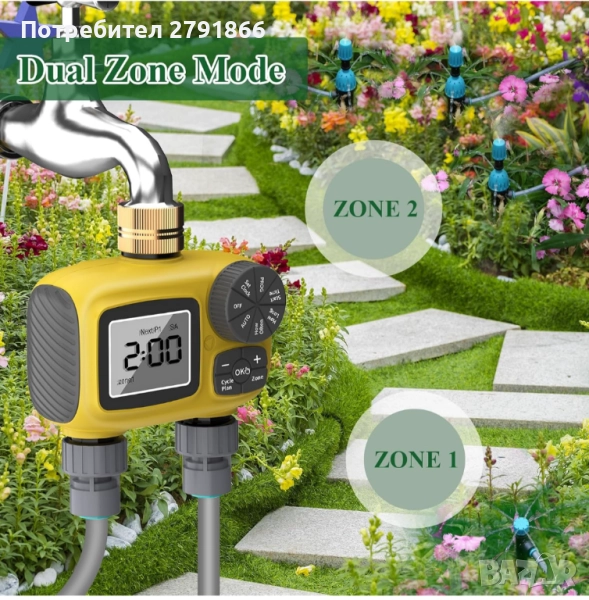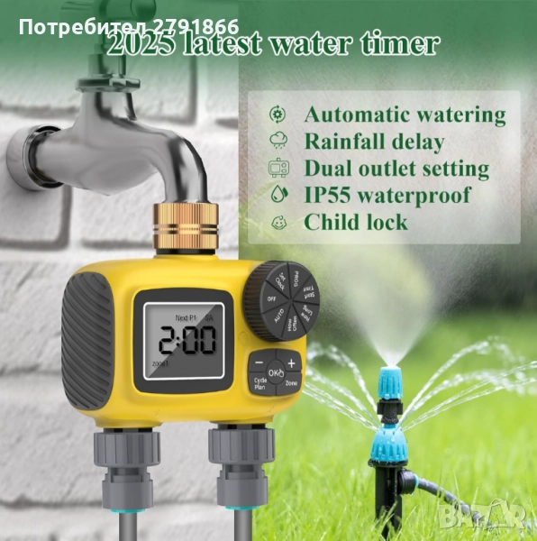 Най-новият двупортов таймер от 2025 г. с три независими програми за поливане, напояване с 3 вида капкови дюзи за градина/оранжерия/трева