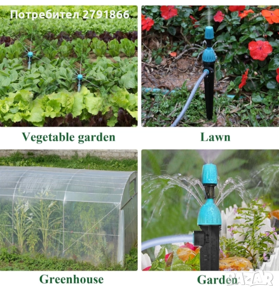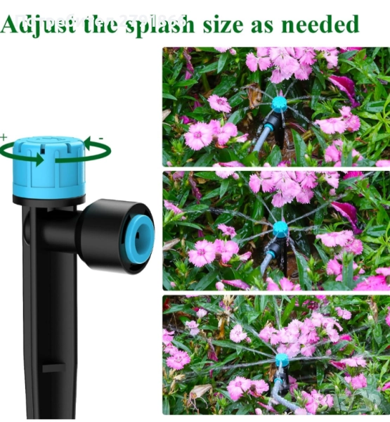 - [4 вида капкови глави] Този комплект таймер за вода се предлага с четири вида капкови глави: 8-дупкова разпръсквателна глава за вграждане в земята, разпръсквателна глава за фонтан, капкообразуватели за напояване с пръскане и пулверизираща дюза с един изход, като горната част на главата на капковия разпръсквач може да се завърта, за да се получат пръски с различни размери, за да се задоволят различни нужди от поливане на растенията.