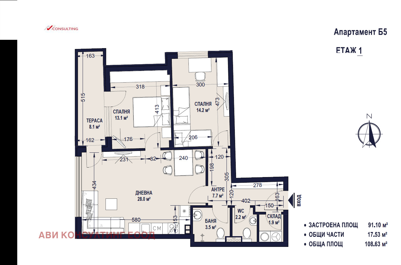 Апартамент Б5 се намира на 2-ри етаж, над висок партерен етаж (3.5 метра), с изложение север-запад. Застроената му площ е 91.10 м2, а площта с общите части е 108.63 м2.