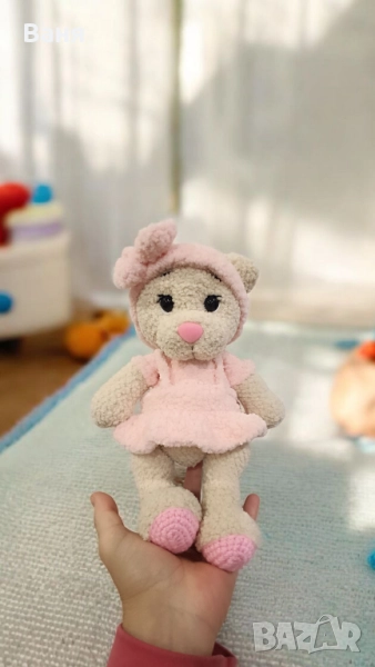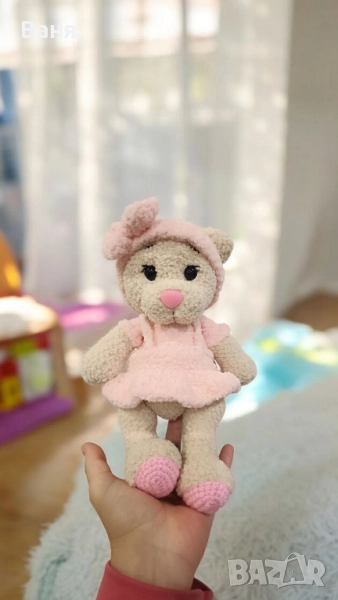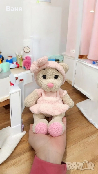 Ръчно плетено мече с розова рокля и диадема.Силиконов пълнеж