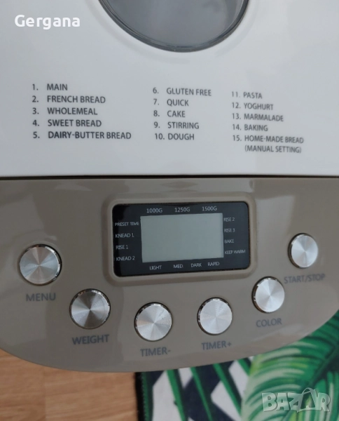 Разполага с 15 програми основна, френски хляб, пълнозърнест, сладък, млечно-маслен хляб, безглутенов, ърза, кекс, бъркане, замесване на тесто, тесто за паста, йогурт, мармалад, печене, домашен хляб (ръчна настройка).