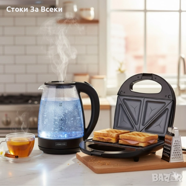 Практичен комплект за съвременния дом - тостер Royal Swiss SLS1057C и електрическа кана Homestar. Идеален за семейства, които ценят удобството, дизайна и вкуса на перфектната закуска.