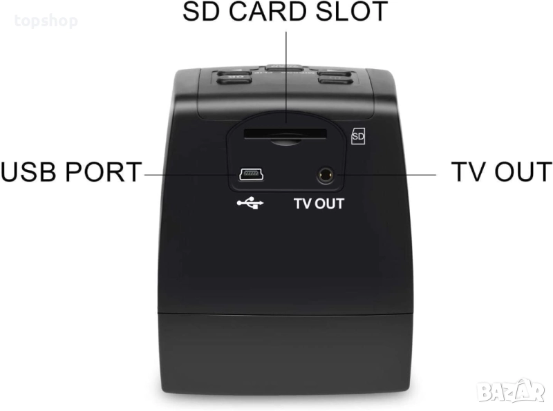 Самостоятелен и не изисква компютър, прехвърля старите ви филми/слайдове в цветен или черно-бял вид на SD карта (до 32GB, не е включена) и поддържа регулиране на яркостта или цвета на изображението.