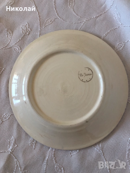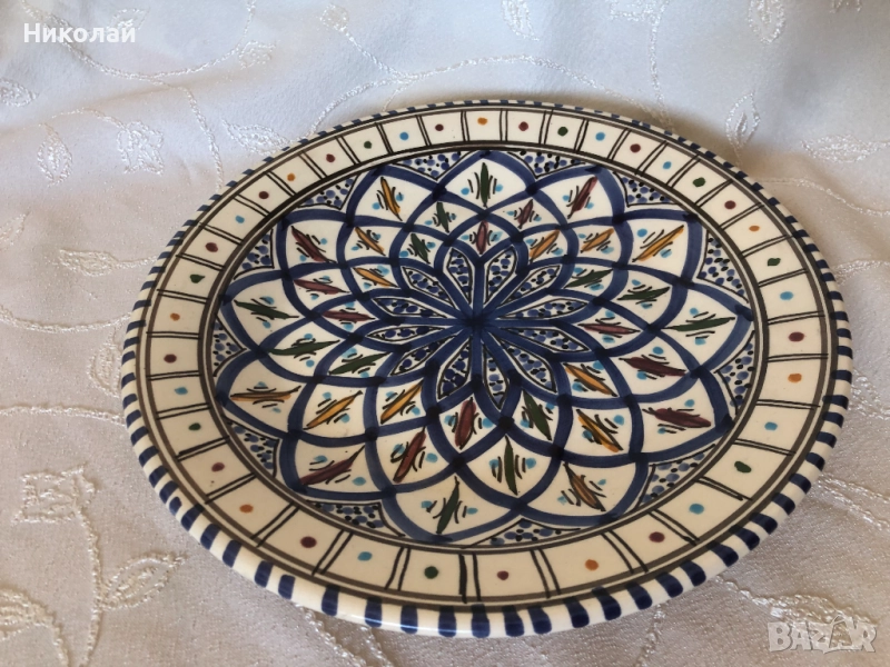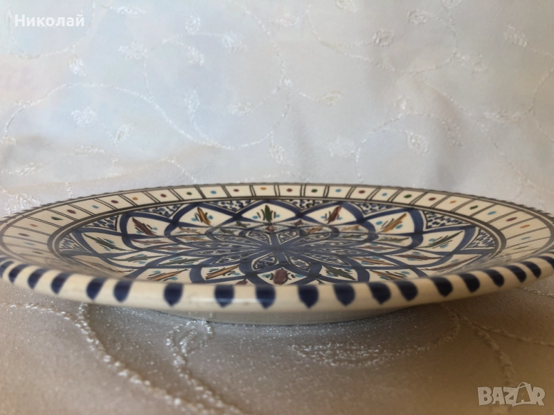 Тунизийска керамична чиния, ръчно изработена и рисувана от майстор занаятчия. Диаметър 25 см. височина 3 см. Купувана е през 2006 г. от занаятчийско ателие Le Jasminв гр. Набеул, което е удостоверено с печата на гърба на чинията. Никога не е използвана, само съхранявана.