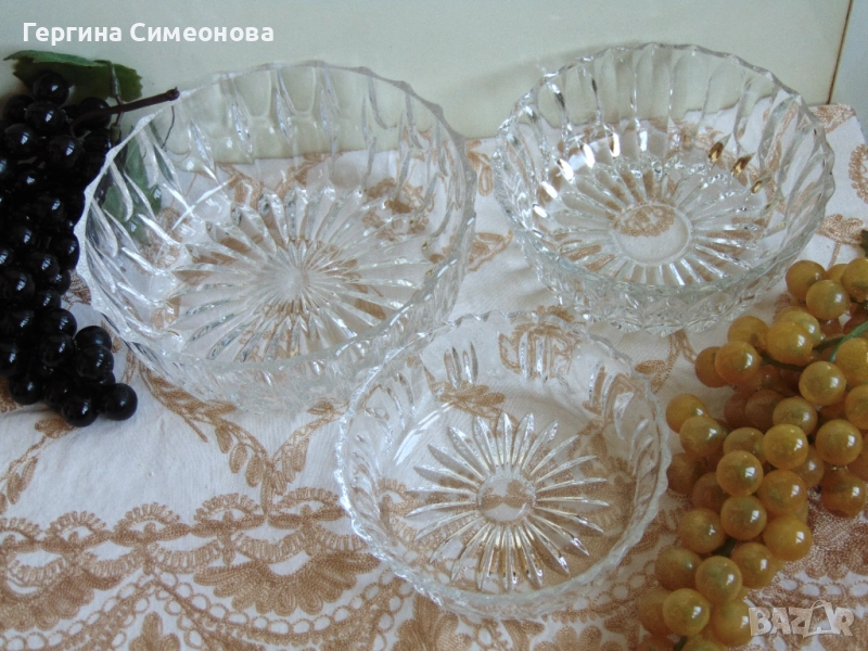 Лот от три кристални купи, три чинийки, две подносчета. Купите са с размери: голяма - 20см диаметър, 7.5см височина
