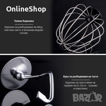 Приставки в комплекта: кука за тесто, плоска бъркалка, тел за разбиване;