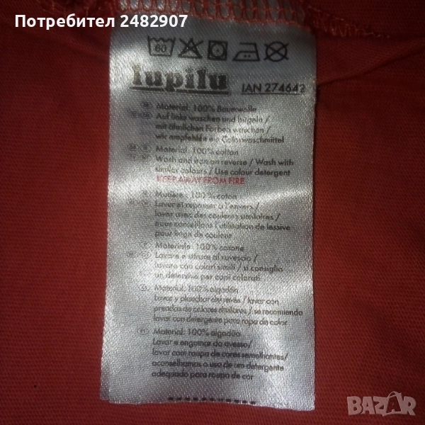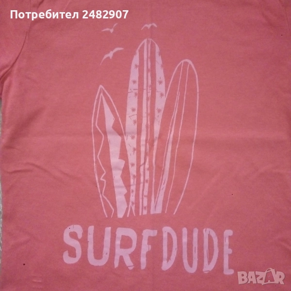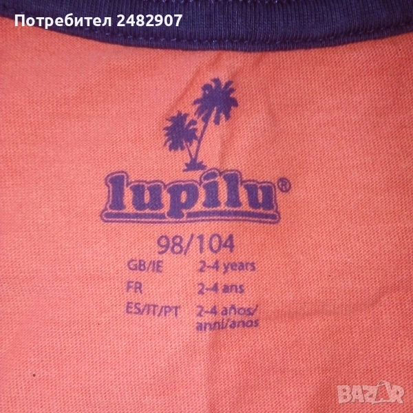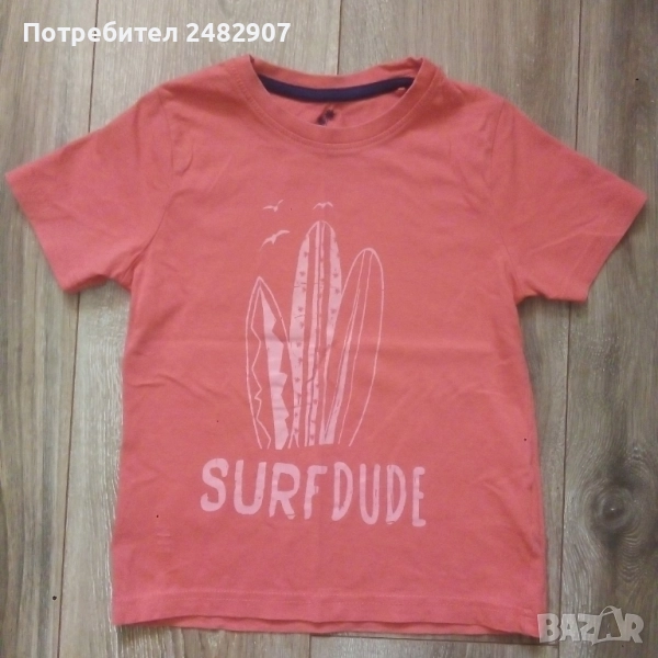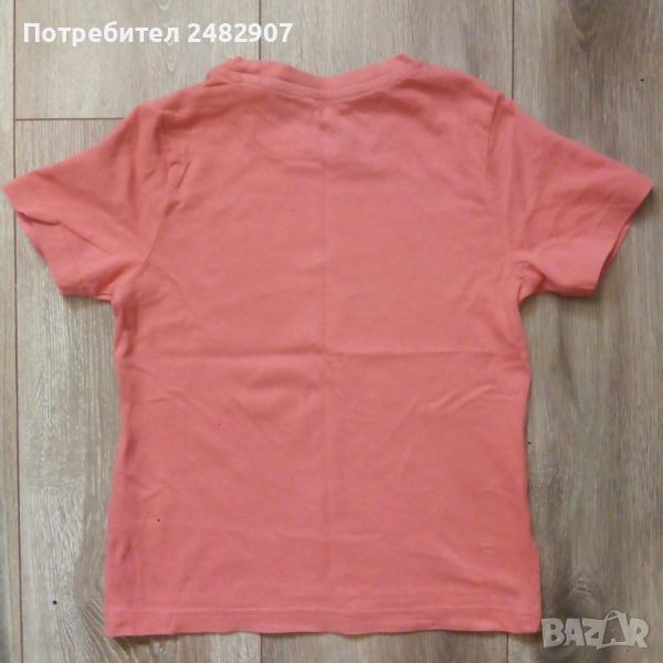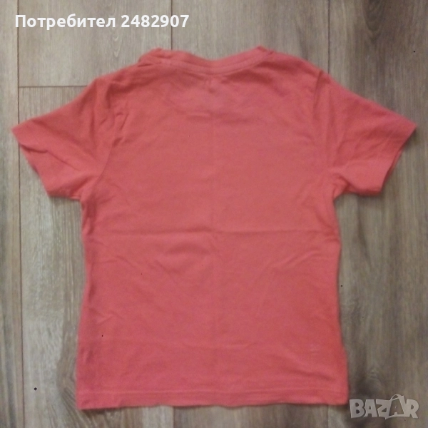 Детска тениска с щампа, цвят корал за възраст 2-4 години. Съдържа 100 % памук. Ширина в раменете - 28 см, ширина под мишниците - 35 см, ширина в долната част - 35 см, дължина от рамото до долу - 44 см, дължина на ръкава от рамото - 14 см, ширина на ръкава в долната част - 11,5 см. Много запазена, почти не е използвана, без забележки.