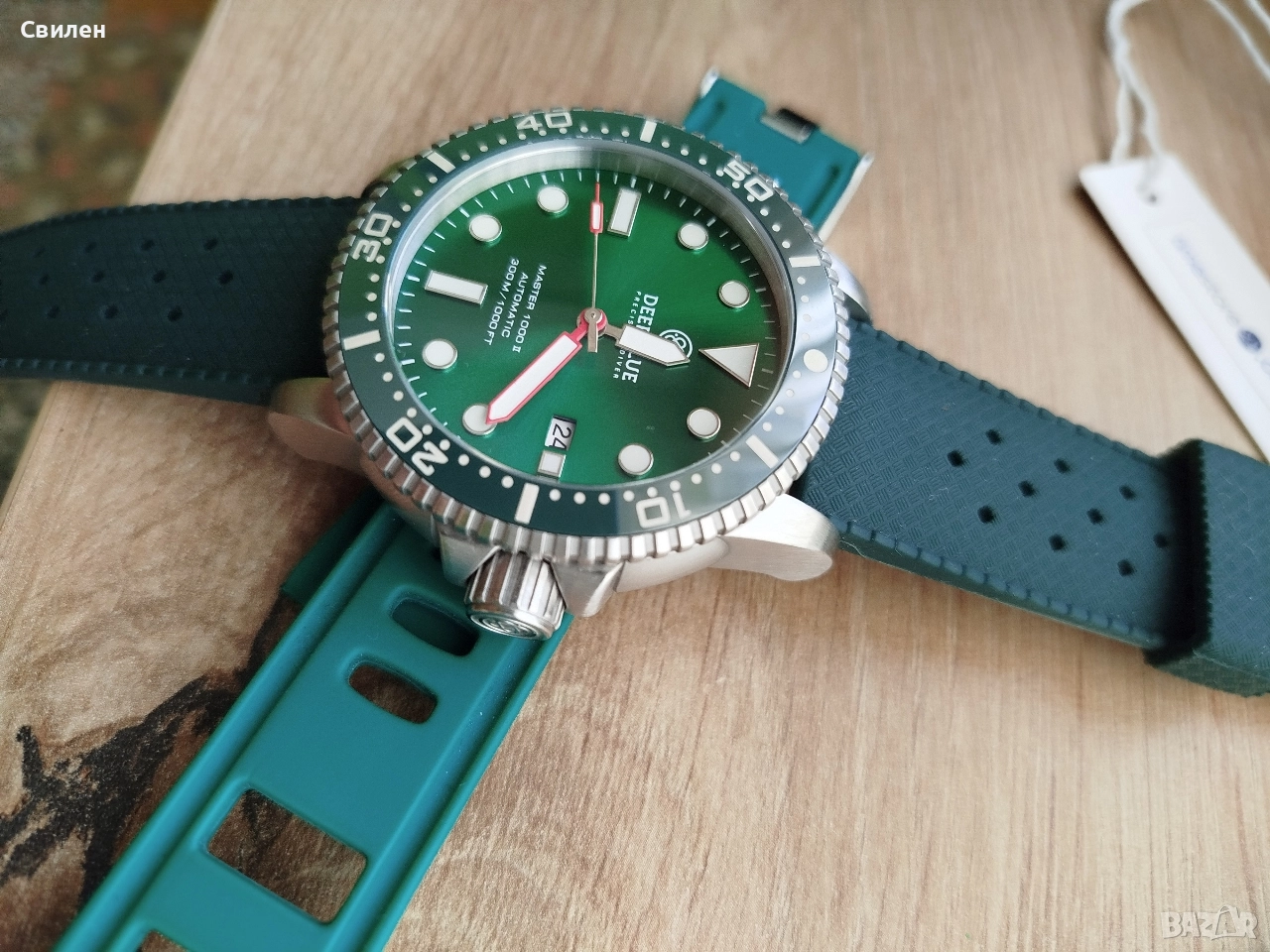 Брутален дайвър на американския микробранд Deep Blue. Модел Master Diver 1000 2 Референтен номер 7021005 Перфектна изработка с много внимание към детайла , касата наподобява със закръглените си форми на модели на Орис. Наситен sunburst циферблат в зелено , заедно с керамичен еднопосочно въртящ се безел. Стрелки , маркери и индексите на безела със страхотна подсветка . Часовник в пълен комплект , като в момента е на много подходяща Tropic зелен силикон в цвят на безела, давам и светло зелен силикон заедно с него. Карта, книжка и оригинална кутия на Deep Blue, както е купен. Перфектно състояние - като нов. Caliber: Seiko NH 35 Automatic, 24 jewels- машината върви перфектно, в момента дава отклонение от 4 секунди на ден. Компликация -дата на 3 часа. Супер луминова - стрелки, маркери и безел- наистина брутална подсветка. Стъкло -Сапфир кристал Каса -стомана с размер 44 мм Ръчен хелиев клапан с корона на 10 часа Водоустойчивост -300 М, корони на винт, заден капак на винт. Ширина на лъговете -22 ММ , дава възможност за най различни каишки , силикони , кожи и тн Състояние като нов. Намира се в Русе, пътува Апо куриери с преглед и тест.