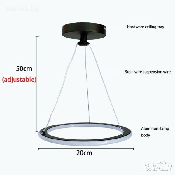 МОДЕРЕН РЕГУЛИРУЕМ ПОЛИЙЛЕЙ, 1 ПРЪСТЕН, БЯЛ - Максималната височина на модерния висящ аплик е 50 см. Дължината на въжето може да се регулира свободно, за да отговаря на вашите различни нужди.