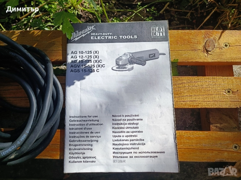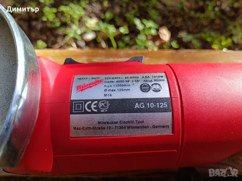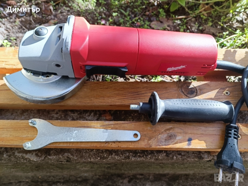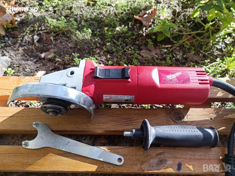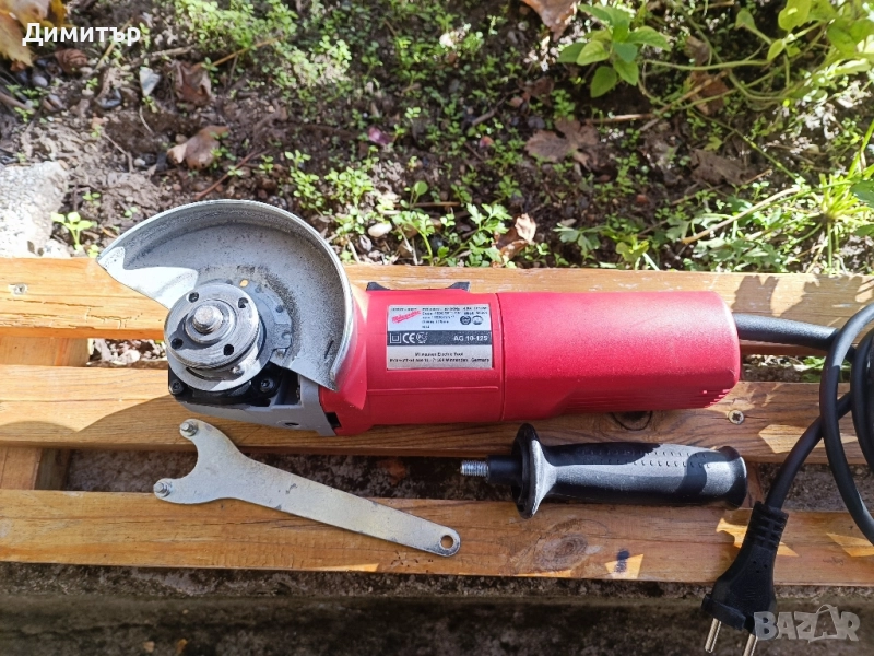 Оригинален ъглошлайф в отлично състояние, практически без забележки по външния вид. Работи без отклонения от нормалното. В комплект с предпазител, странична ръкохватка, ключ и инструкции. Няма регулиране на оборотите.