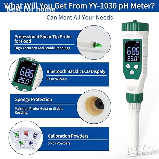 YY-1030 Интелигентен Bluetooth pH метър за храни, високоточен pH тестер с LCD подсветка, ATC, за меки твърди проби