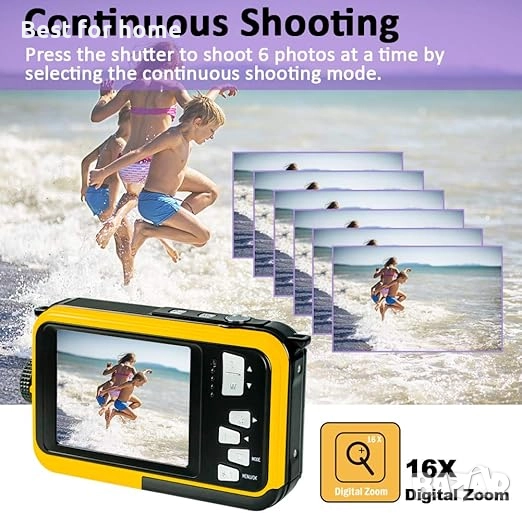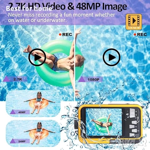 【48MP изображение, 2.7K видео】Подобрена до по-висока резолюция, тази подводна камера може да заснема 48 мегапиксела висококачествени JPEG снимки. С опцията за видео резолюция 2.7K можете да запишете вашите изключително готини моменти в AVI формат с ярки цветове. 16-кратното цифрово увеличение позволява на водоустойчивата камера да улови ценните моменти наблизо, далеч и между тях.