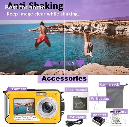 【Водоустойчивост, удароустойчивост на 3 метра】Тази подводна камера е напълно водоустойчива и можете да се гмуркате до 3 метра за един час, без да използвате допълнителен калъф за защита. Каишката за китката гарантира, че няма да загубите водоустойчивата камера, докато се гмуркате с шнорхел, плувате или се носите по течението. Вградената функция против трептене осигурява стабилни и плавни снимки.